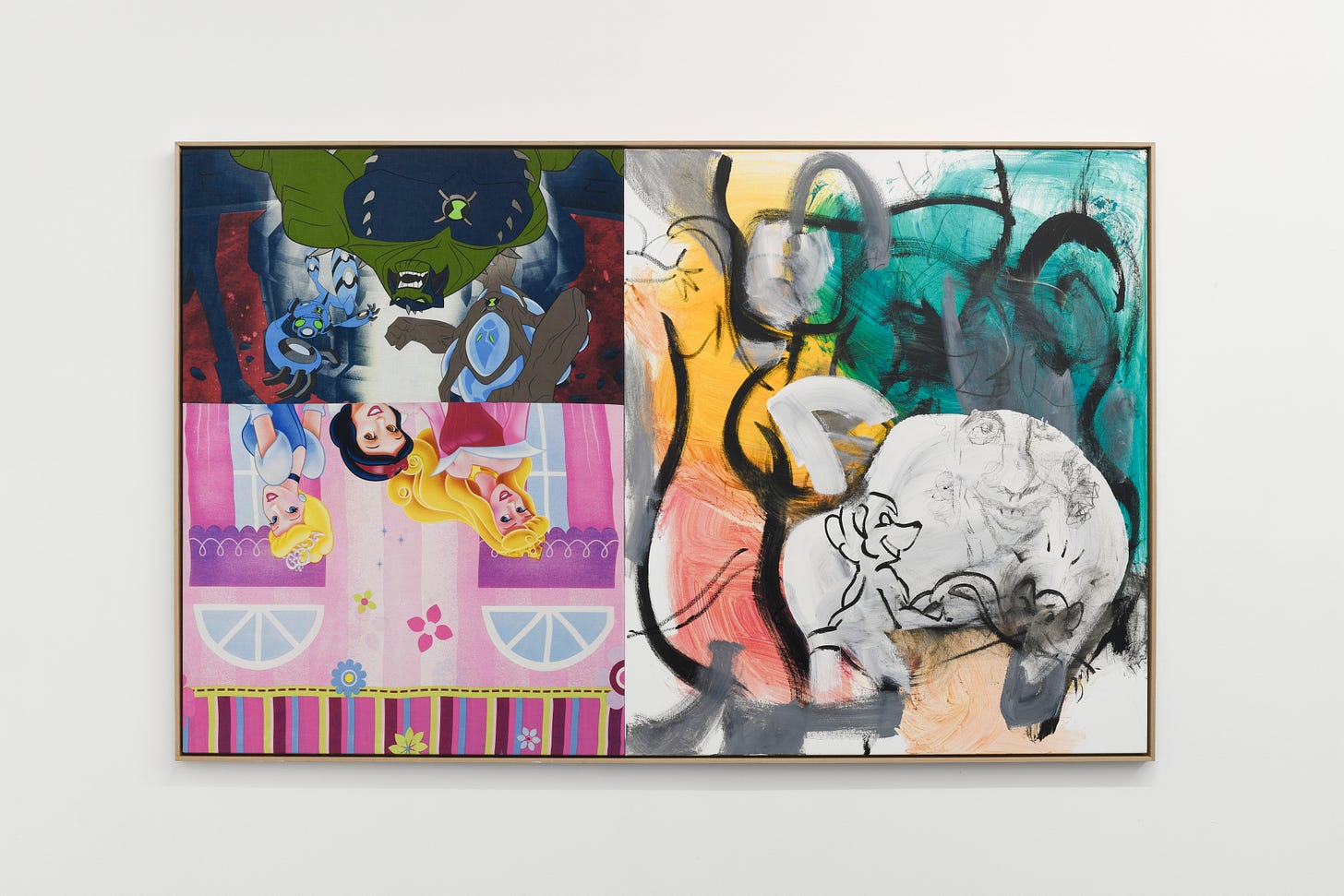 Ben Aitken takes no prisoners. Or, if he does, they are left scrabbling for a safe shoal of sanity. It’s nigh impossible to know where Aitkins’ surfeit of strangeness is spawned – there are hints of colourful nightmares, moments of saturated psychological protest, a diabolical Walt Disney on bad, bad lysergic acid. With a juxtaposition of anarchic painterly mayhem and still-birth animation there are hints of a schizophrenic civil war occurring on the canvas, one part writhing and squirming like fly-blown maggots caught in the desert sun, the other side receding into a cutesy cacophony of light-hearted Snow White fantasy which carries the whiff of desperate escape, try to think of something nice as the drill hits the nerve…